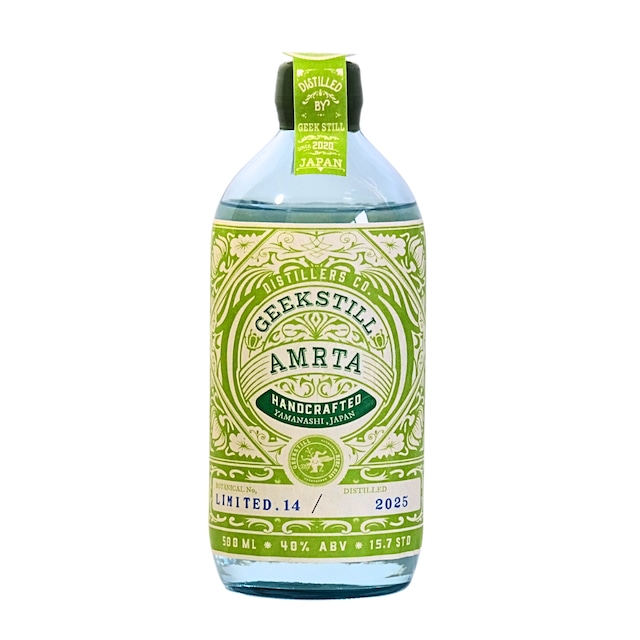 サンスクリット語で「万能薬」の意味を持つ「AMRTA(アムリタ)」。山梨の豊かな自然に囲まれた蒸留所「GEEKSTILL」でつくられており、山野のハーブや、フルーツ王国である山梨県のフルーツの風味など、山梨県の大自然の恵みをボトルに詰め込んだつくりとなっています。 ボタニカルNo. : 1.ジュニパーベリー 70.ナシ(ル・レクチェ) 【メーカー紹介文】 <ストーリー> 2026年最初のAMRTAは、年末にじっくりと仕込んだル・レクチェを贅沢に使用した、フルーティなGINに仕上がりました。 以前にも一度ル・レクチェでの製造に挑戦したことがありましたが、その時は思うような仕上がりにならず、残念ながらお蔵入りとなりました。今回の仕込みを通して、改めて果実そのものが持つポテンシャルの重要性を強く実感しています。 そんな折、いつもAMRTAをご愛飲いただいているお客様から「身内がル・レクチェを作っているのですが、GINになりますか?」とご相談をいただきました。過去に試した経験と、その際に納得のいく結果が得られなかったことを正直にお伝えしたところ、「それでもぜひ、このル・レクチェで試してほしい」とのお声をいただき、栽培や収穫のタイミングなどを細かく調整していただいた上で、今回の仕込みが実現しました。 遠く佐渡島から届いたル・レクチェは、箱を開けた瞬間に立ち上るほど芳醇な香りで、その香りだけで酔ってしまいそうなほどでした。この魅力を余すことなくGINに移すべく、全力で仕込みを行っています。 新年の幕開けを飾る一本にふさわしい仕上がりになったと感じています。 どうぞお楽しみください。 原産国:日本 メーカー:GEEKSTILL アルコール度数:40% 容量:500ml 【GEEKSTILL】 蒸留所の名前「GEEKSTILL」は「オタク」「マニアック」な蒸留所を意味し、マスターディスティラーの岸川氏が季節ごとに手摘みしたボタニカルを厳選して使用するなど、そのこだわりが表れています。ボタニカルには、「ブドウの花」をはじめとする山梨県産の植物が多く、風味の繊細さを最大限に引き出すため、減圧蒸留と常圧蒸留を使い分ける製法が採用されています。 また、アムリタジンのスピリッツには日本酒をベースにしたライススピリッツが使われており、ほのかな甘みと優しい香りが特徴です。この日本酒ベースのスピリッツは、ボタニカルの香りを邪魔せず、ジンに上品な深みを加えています。こうした特別な製法により、風味豊かでありながらまろやかな仕上がりが楽しめるのが特徴です。 さらに、昭和の薬瓶をイメージしたデザインやというサンスクリット語の名前も、このジンの個性を際立たせています。そして、ボタニカルに番号を付けて、それがそのまま品名になっていることも非常に個性的です。 GEEKSTILLについて詳しく知りたい方は、ジンラボジャパンの特集記事から↓ https://ginlab-japan.com/1613/