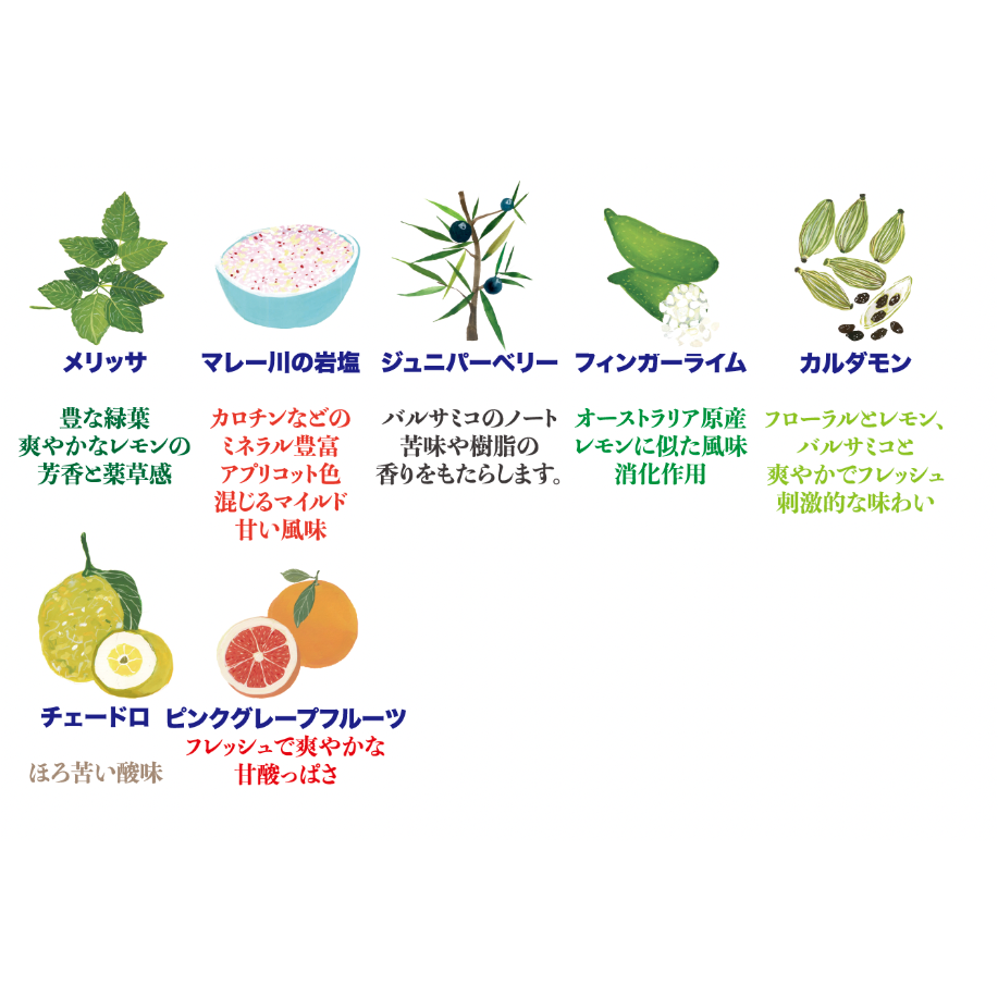 6種類のボタニカル(メリッサ、フィンガーライム、カルダモン、チェードロ、ピンクグレープフルーツ、ジュニパーベリー)を別々に漬け込み、別々に蒸留したのちにブレンドし、マレー川ののミネラル豊富な岩塩で味を整えています。