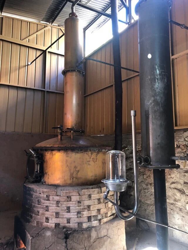 今から約150年前、最初にこの地域に水路を引きブドウ栽培を始めた家族から3代目となる現在は、3姉妹が醸造などを担当し、約10ヘクタールの畑に2種類のマスカット(モスカテル)種を栽培、無添加の白ワイン、その白ワインから造られるパハレテ(伝統的な甘口ワイン)、ピスコ(ブドウの蒸留酒)、ジンを造っています。ブドウはもちろんすべて手摘み。その他の工程も全て手作業で、使用している昔ながらの蒸留器やコンクリートタンクが目をひきます。ワイナリーの建物はとても古く、初代が使っていた農機具、ワインの保管に使っていた洞窟などを見ることができます。
