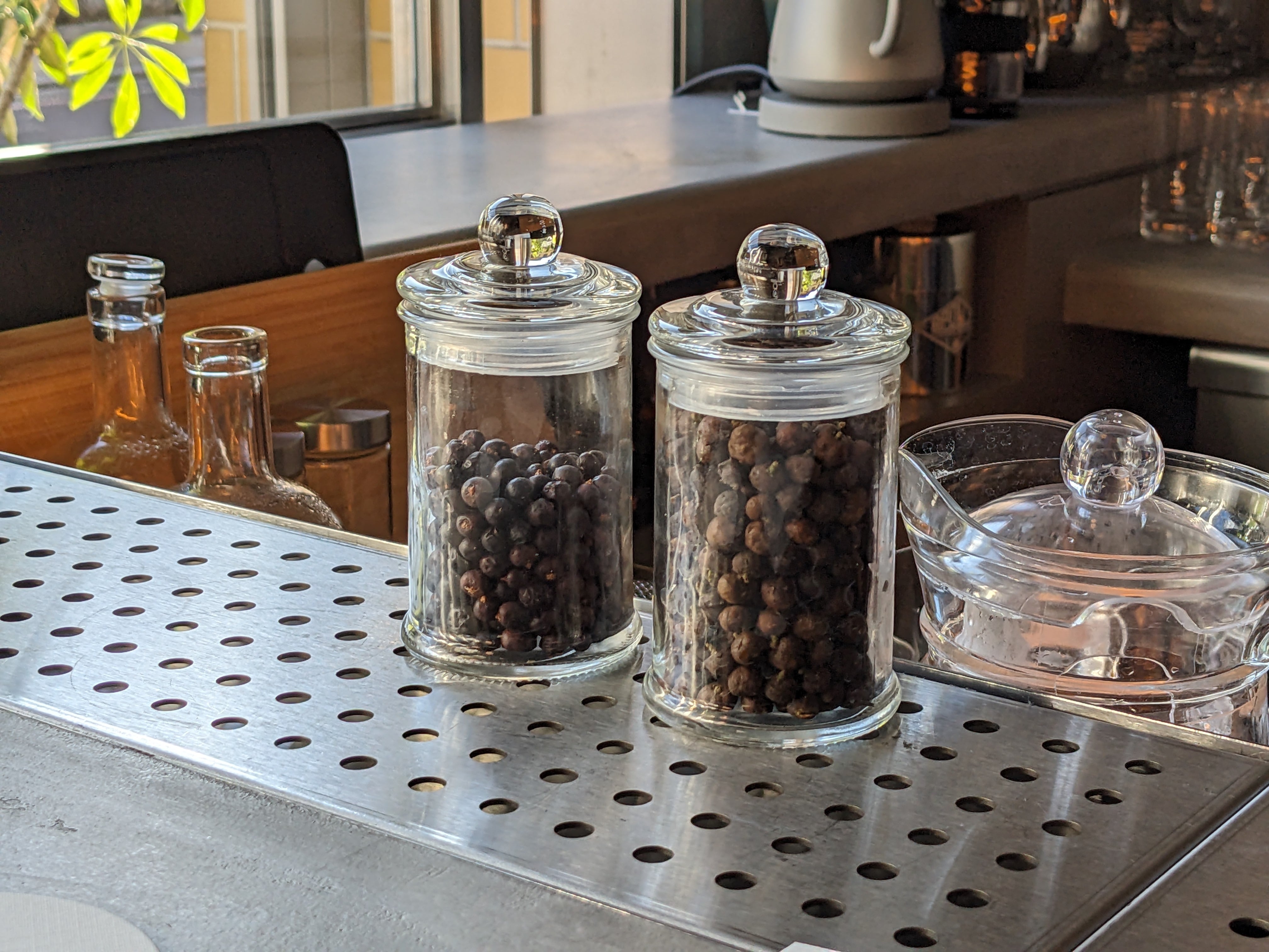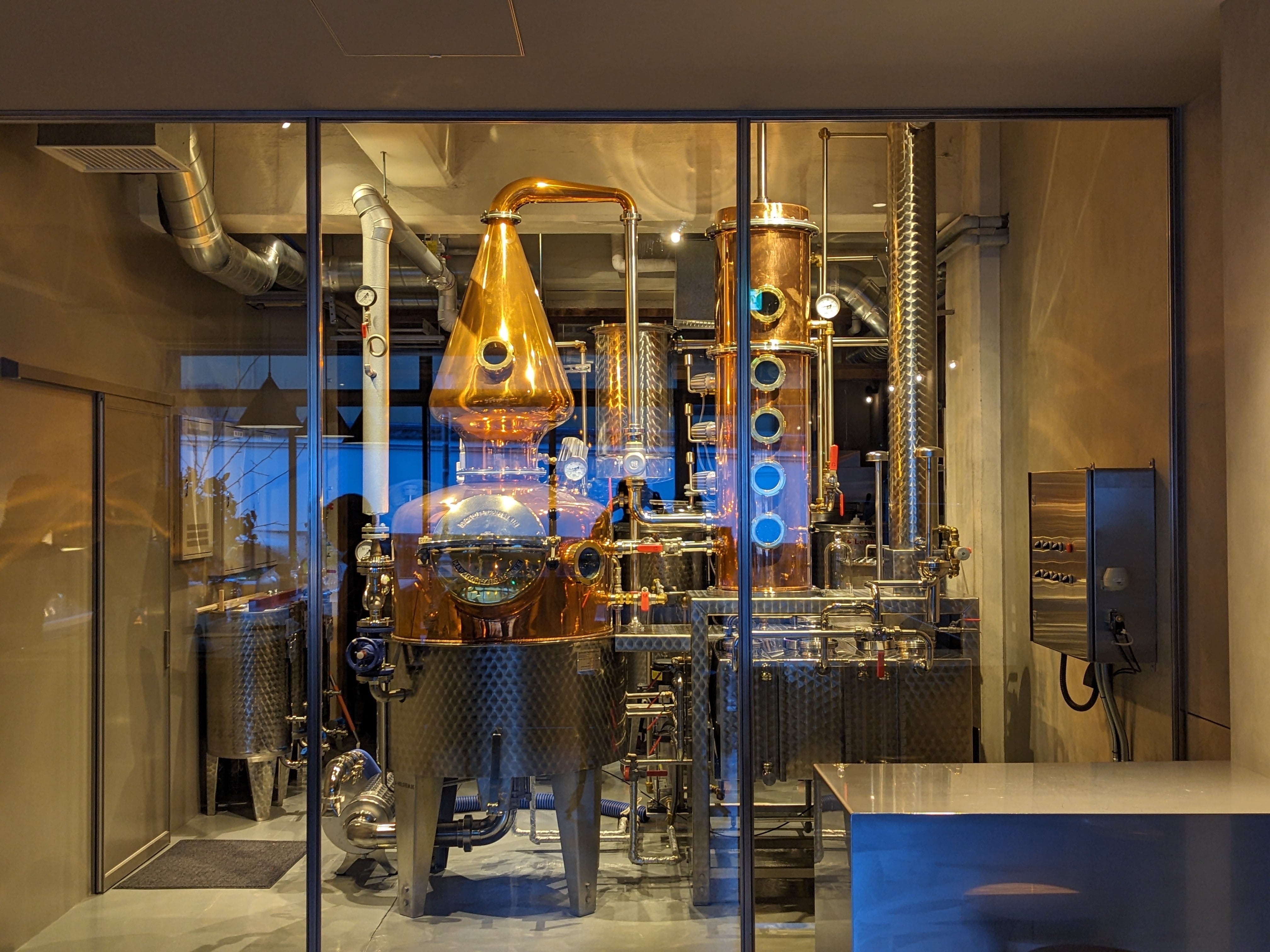 蒸溜所の特徴は、かつて畳屋として使われていた建物を再活用し、アーノルドホルスタイン社製の300L蒸留器を導入した本格的な設備。その導入にあたり、釜谷氏はドイツに渡りアーノルドホルスタイン社と実際に協議したりモンキー47の蒸溜所も視察するなど、細部にまでこだわり抜いています。蒸溜からボトリング、ラベル貼りに至るまでのすべての工程を手作業で行い、併設されたバーでは、ガラス越しに蒸留器を眺めながら本格的なジンカクテルを楽しめる贅沢な空間も魅力です。