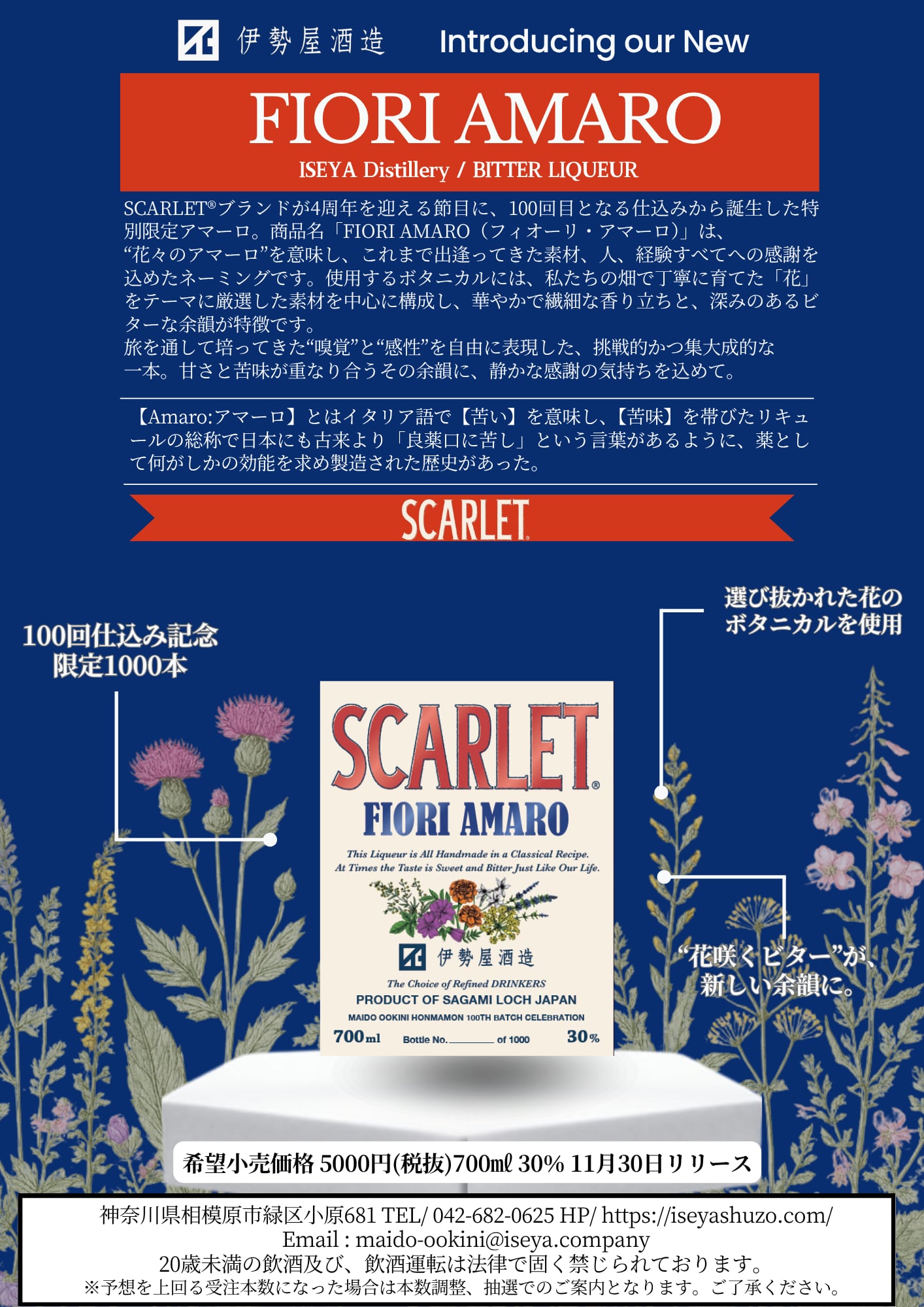 SCARLET®ブランドが4周年を迎える節目に、100回目となる仕込みから誕生した特別限定アマーロ。商品名「FIORI AMARO(フィオーリ・アマーロ)」は、“花々のアマーロ”を意味し、これまで出逢ってきた素材、人、経験すべてへの感謝を込めたネーミングです。使用するボタニカルには、私たちの畑で丁寧に育てた「花」 をテーマに厳選した素材を中心に構成し、華やかで繊細な香り立ちと、深みのあるビターな余韻が特徴です。