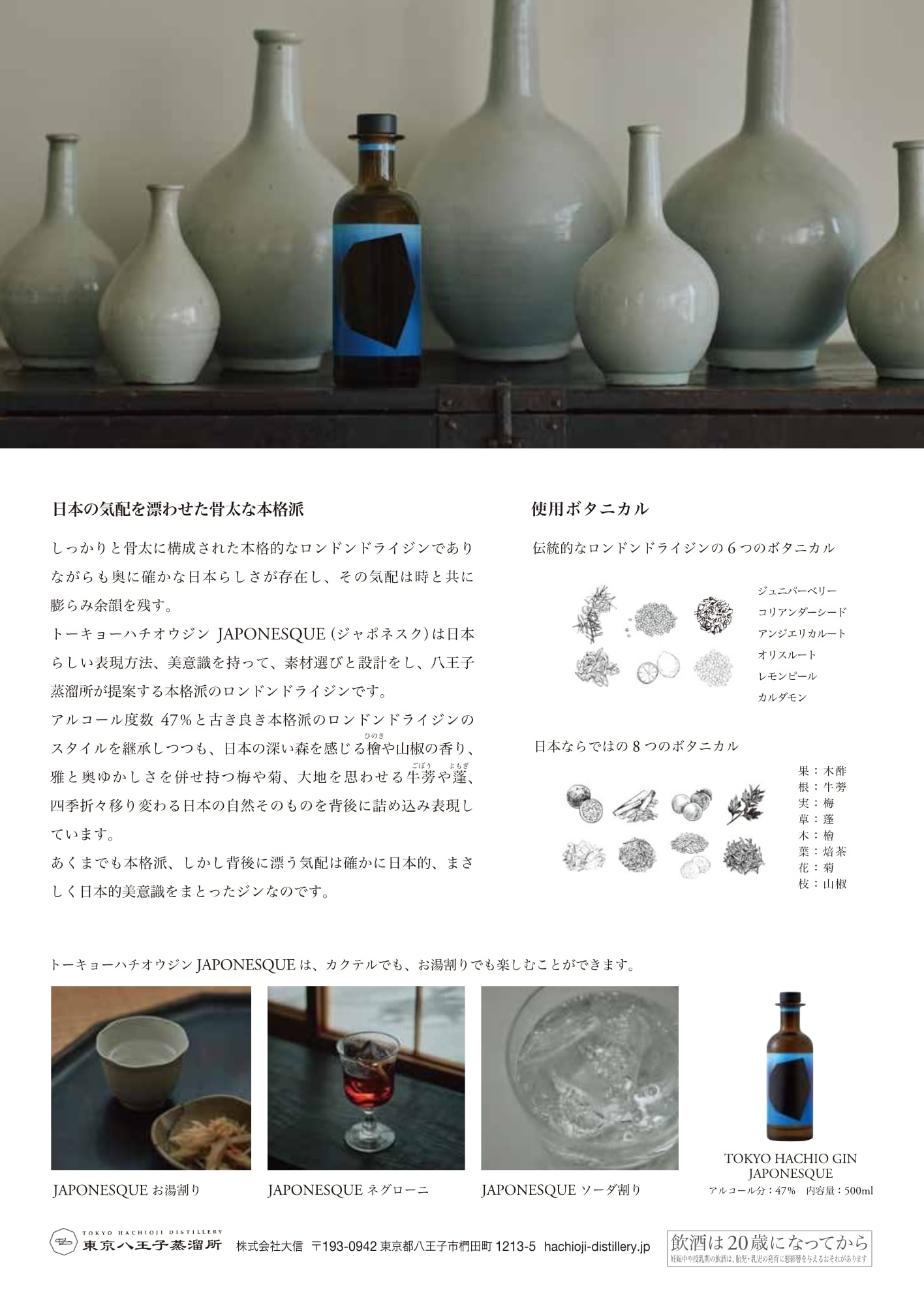 スタンダードな“ロンドンドライジン”のように長く愛され る“ジン”でありたい。 自らが主役だけでなく、脇役でも光るような味わいをも かね揃えたい。 そんな思いを込めて、ボタニカルの素材選び、コーン スピリッツ選び、瓶やラベルなど時間をかけてじっくり吟 味して“トーキョーハチオウジン”は形になりました。