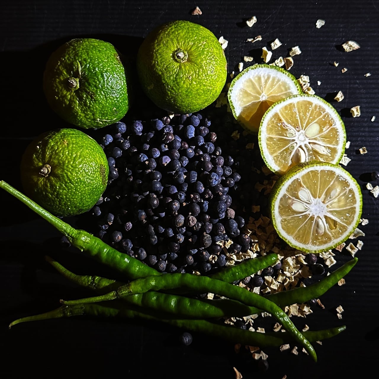 この2種類の地元ボタニカルをくっつけて、伝統調味料の柚子胡椒を再現しました。