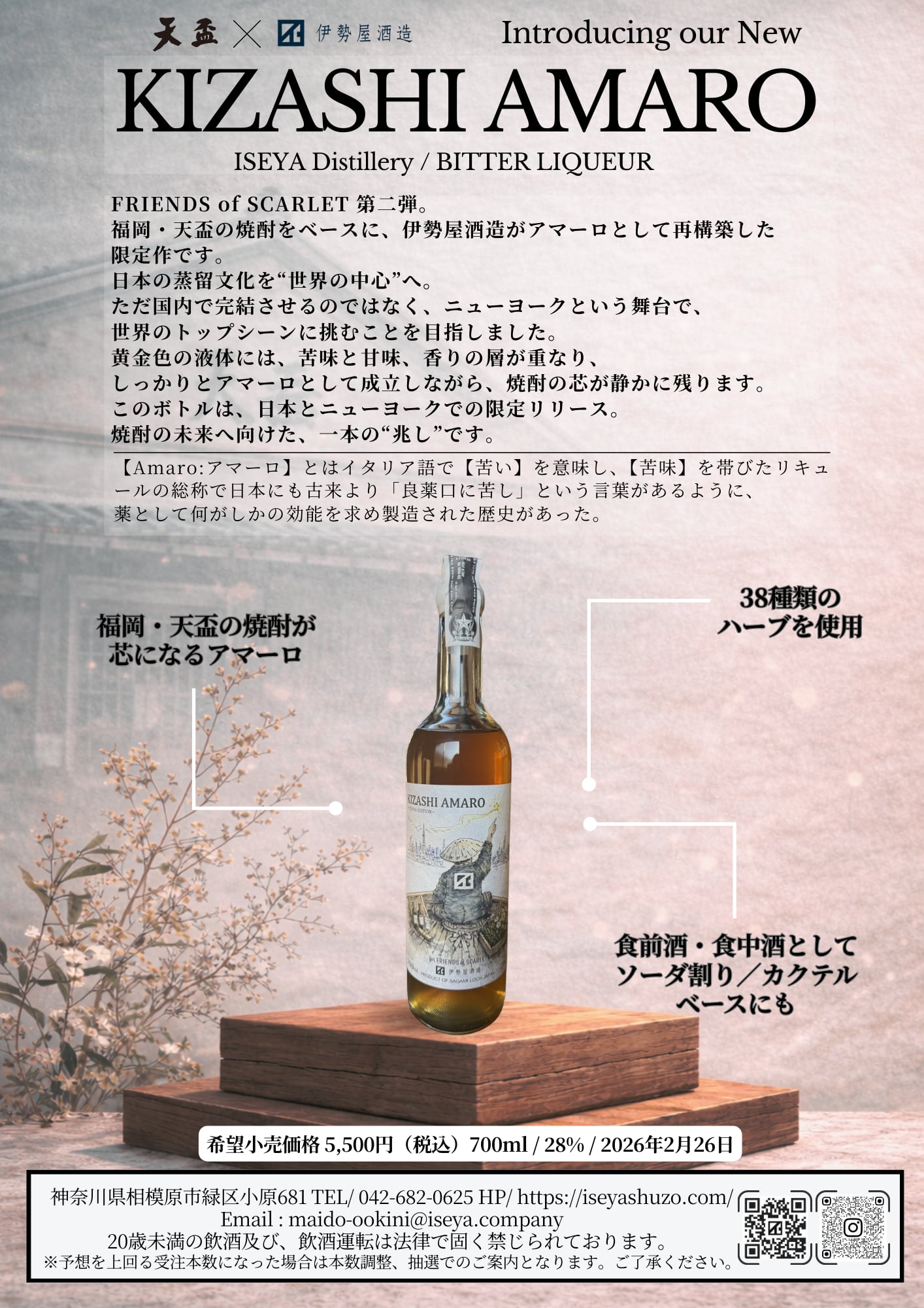 KIZASHI AMAROは、福岡・天盃の焼酎をベースに、伊勢屋酒造がアマーロとして再構築した限定作です。